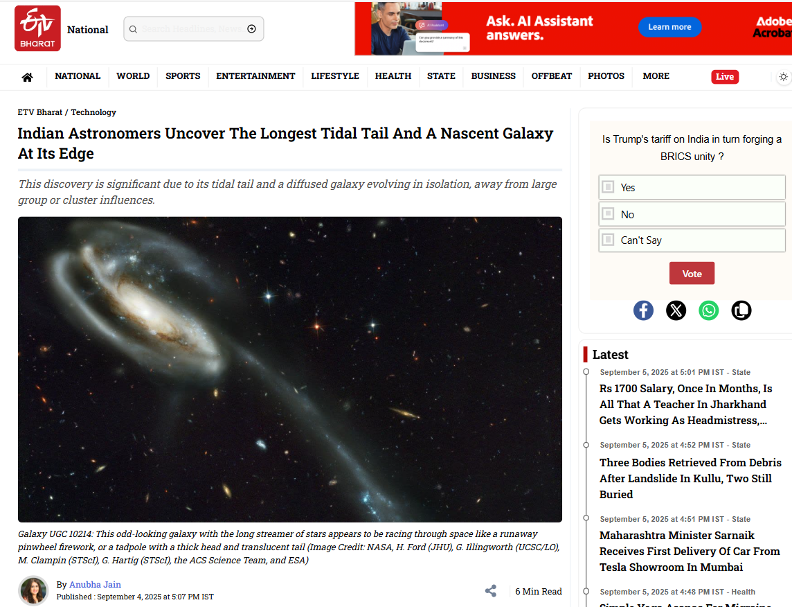 About 430 million light-years away in Leo, astronomers from the Indian Institute of Astrophysics (IIA) and collaborators have spotted an ultra-diffuse galaxy forming at the tip of the longest known tidal tail of galaxy NGC 3785. 🌌