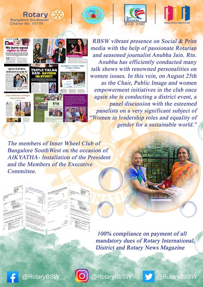 Under the umbrella of Rotary Bangalore Southwest (RBSW) and as the Chair, Women Empowerment & Director Public Image,…