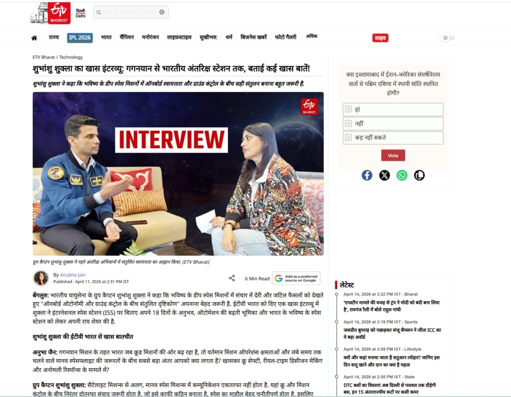 Read my detailed interview report- https://www.etvbharat.com/en/technology/exclusive-interview-shubhanshu-shukla-reflects-on-iss-life-and-indias-gaganyaan-readiness-enn26041002619