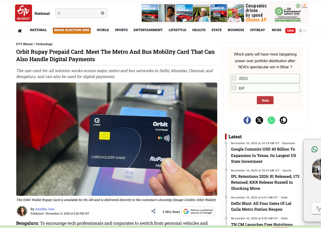 Bengaluru just got a big boost toward smarter, greener commuting. Orbit Wallet, a fintech startup founded by Harshvardhan Zaveri, Aman Bisht and Shikha Chouksey, has launched a RuPay Prepaid Mobility Card that works across major metro and bus networks in Delhi, Mumbai, Chennai and Bengaluru—and doubles up for online shopping & digital payments.