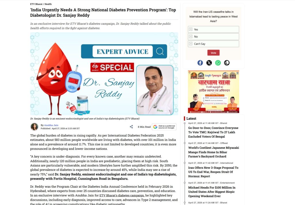 Read the detailed interview in Hindi https://www.etvbharat.com/hi/health/india-urgently-needs-a-robust-national-diabetes-prevention-program-says-top-diabetes-expert-dr-sanjay-reddy-hin26042701877