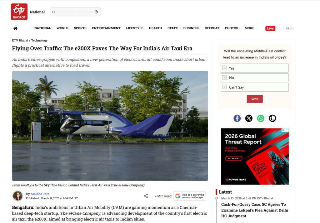 India’s ambitions in Urban Air Mobility (UAM) are gaining momentum as a Chennai-based deep-tech startup, The ePlane Company,is advancing development of the country’s first electric air taxi, the e200X, aimed at bringing electric air taxis to Indian skies.