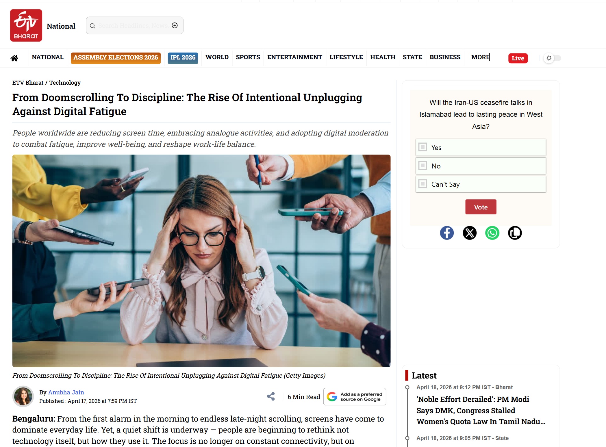 From the first alarm in the morning to endless late-night scrolling, screens have come to dominate everyday life. Yet, a quiet shift is underway — people are beginning to rethink not technology itself, but how they use it. The focus is no longer on constant connectivity, but on conscious engagement. Cutting back on screen time is proving to have tangible benefits, from better sleep and sharper focus to improved productivity at work. In an age of constant notifications and digital overload, the ability to unplug is emerging not as a fleeting wellness trend but as a fundamental shift in how we want to live and work. Read my detailed report with multiple voices- https://www.etvbharat.com/en/technology/from-doomscrolling-to-discipline-the-rise-of-intentional-unplugging-against-digital-fatigue-enn26041702441