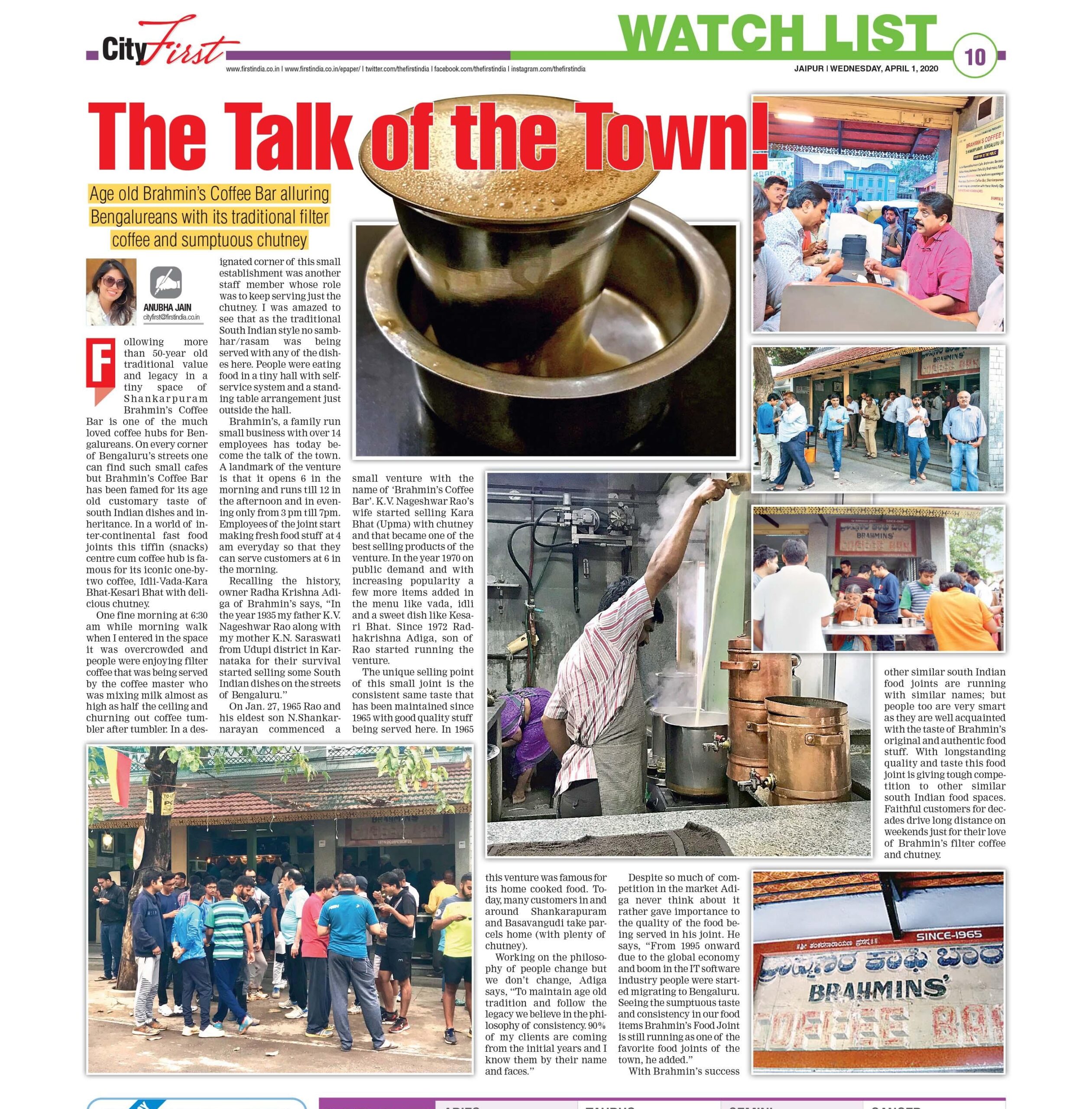 Photo feature “The Talk of the Town-Brahmin Coffee Bar” in First India national Newspaper’s April 1st edition. https://firstindia.co.in/epapers/35 page 10